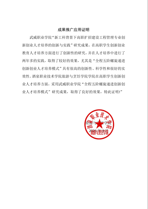 成果推廣應(yīng)用證明(酒泉職業(yè)技術(shù)學(xué)院旅游與烹飪學(xué)院)
