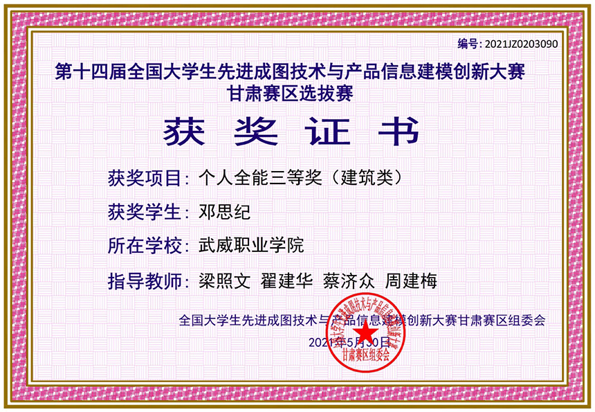 第十四屆全國(guó)大學(xué)生先進(jìn)成圖技術(shù)與產(chǎn)品信息建模創(chuàng)新大賽甘肅賽區(qū)選拔賽獲個(gè)人全能三等獎(jiǎng)(建筑類)