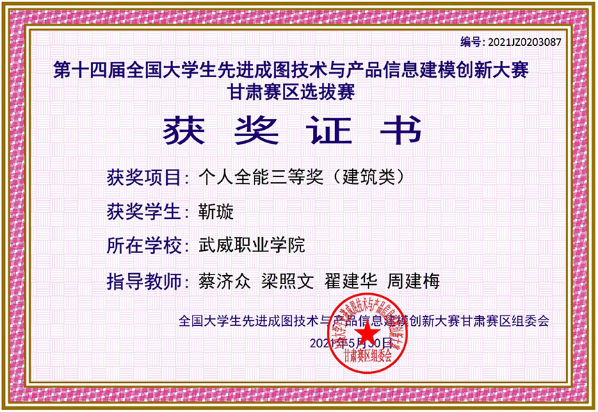 第十四屆全國大學(xué)生先進(jìn)成圖技術(shù)與產(chǎn)品信息建模創(chuàng)新大賽甘肅賽區(qū)選拔賽獲個人全能三等獎(建筑類)