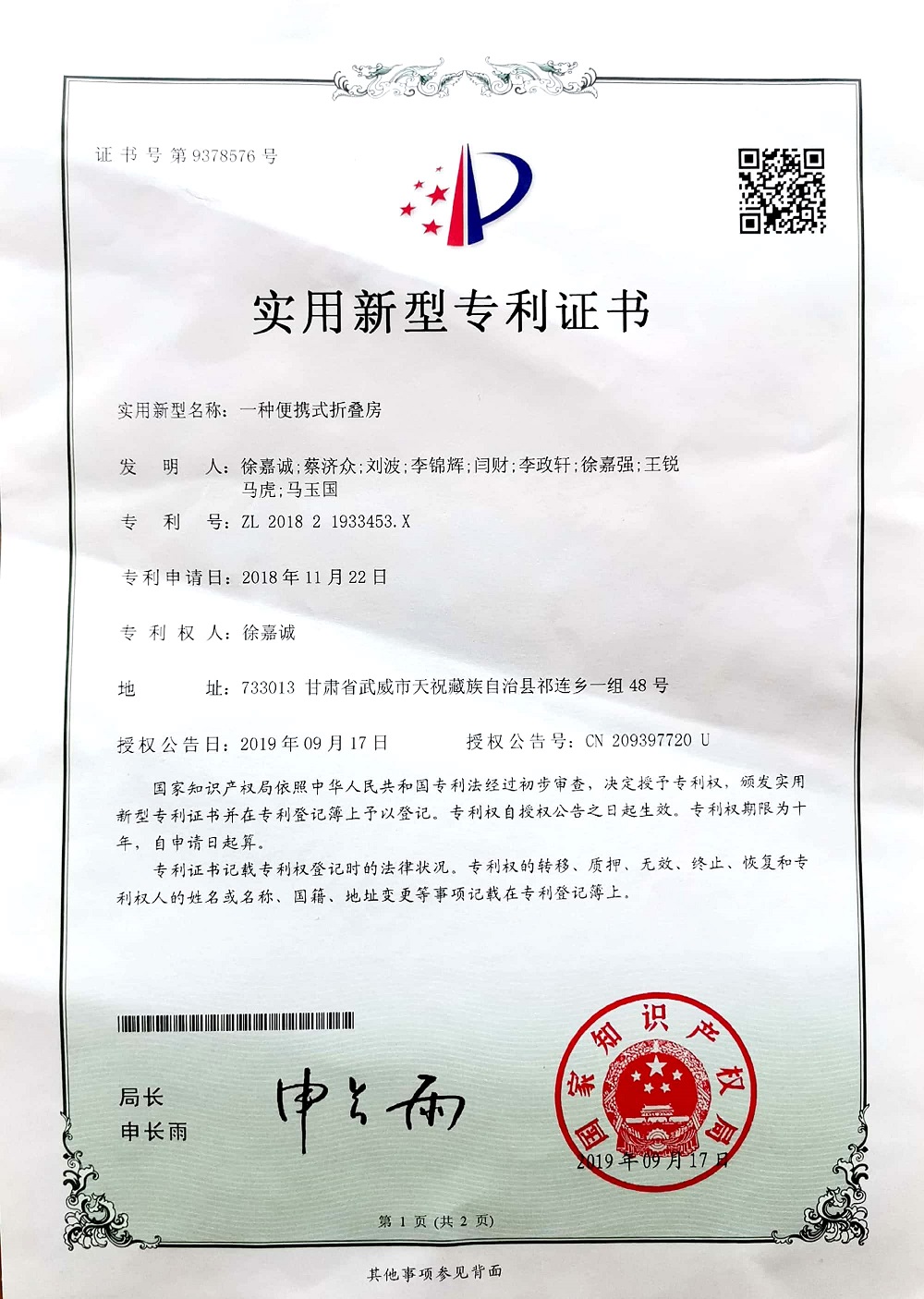 .2019年4月項(xiàng)目組成員崔玉萍獲得國家實(shí)用性專利授權(quán)1項(xiàng)