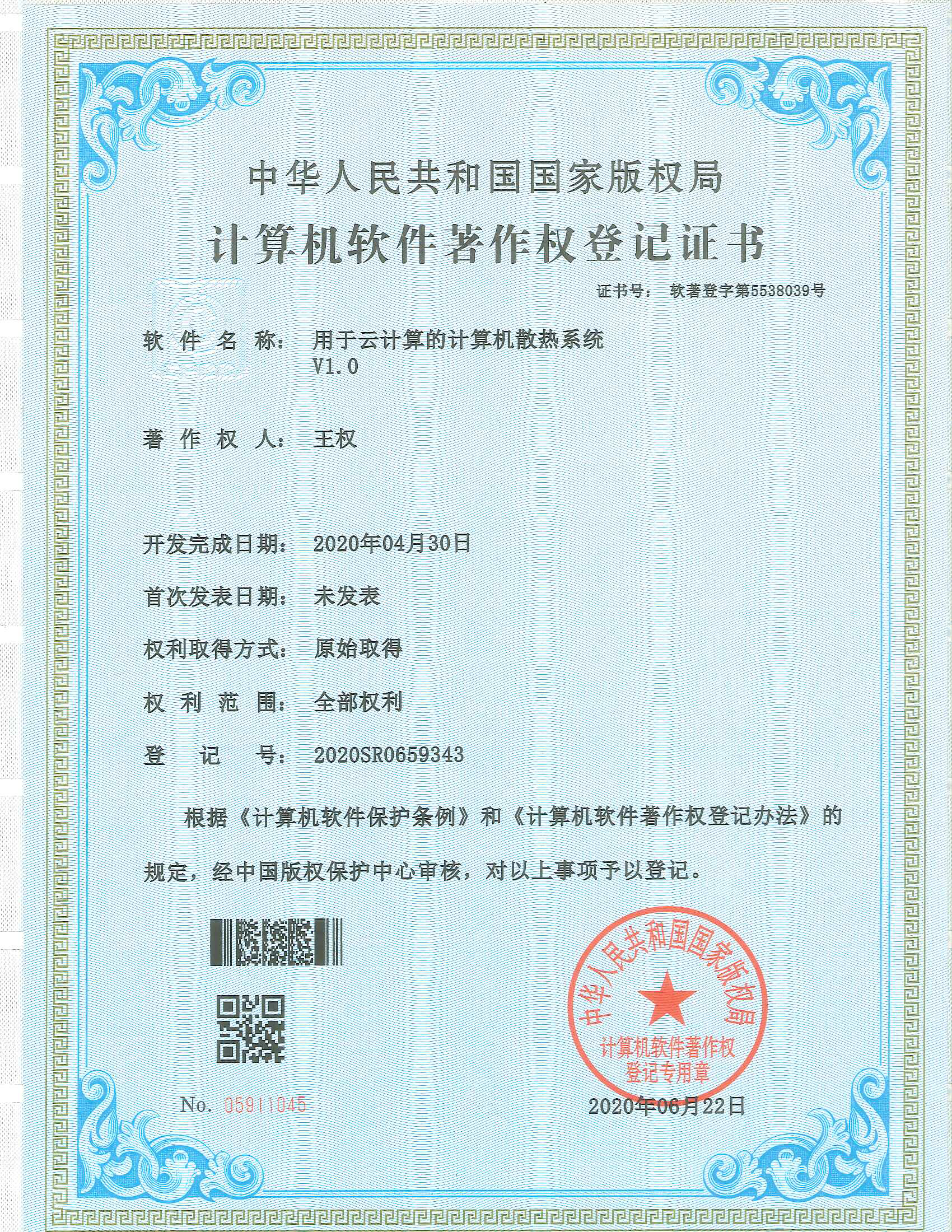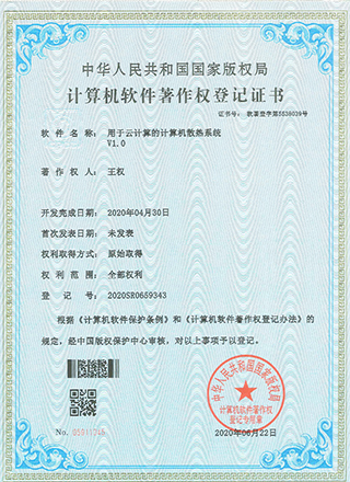 2020年6月項(xiàng)目組成員王權(quán)獲得《用于云計(jì)算的計(jì)算機(jī)散熱系統(tǒng)V1.0》軟件著作權(quán)