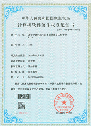 2020年6月項(xiàng)目組成員王權(quán)獲得《基于計(jì)算機(jī)技術(shù)的多媒體數(shù)字工作平臺(tái)V1.0》軟件著作權(quán)