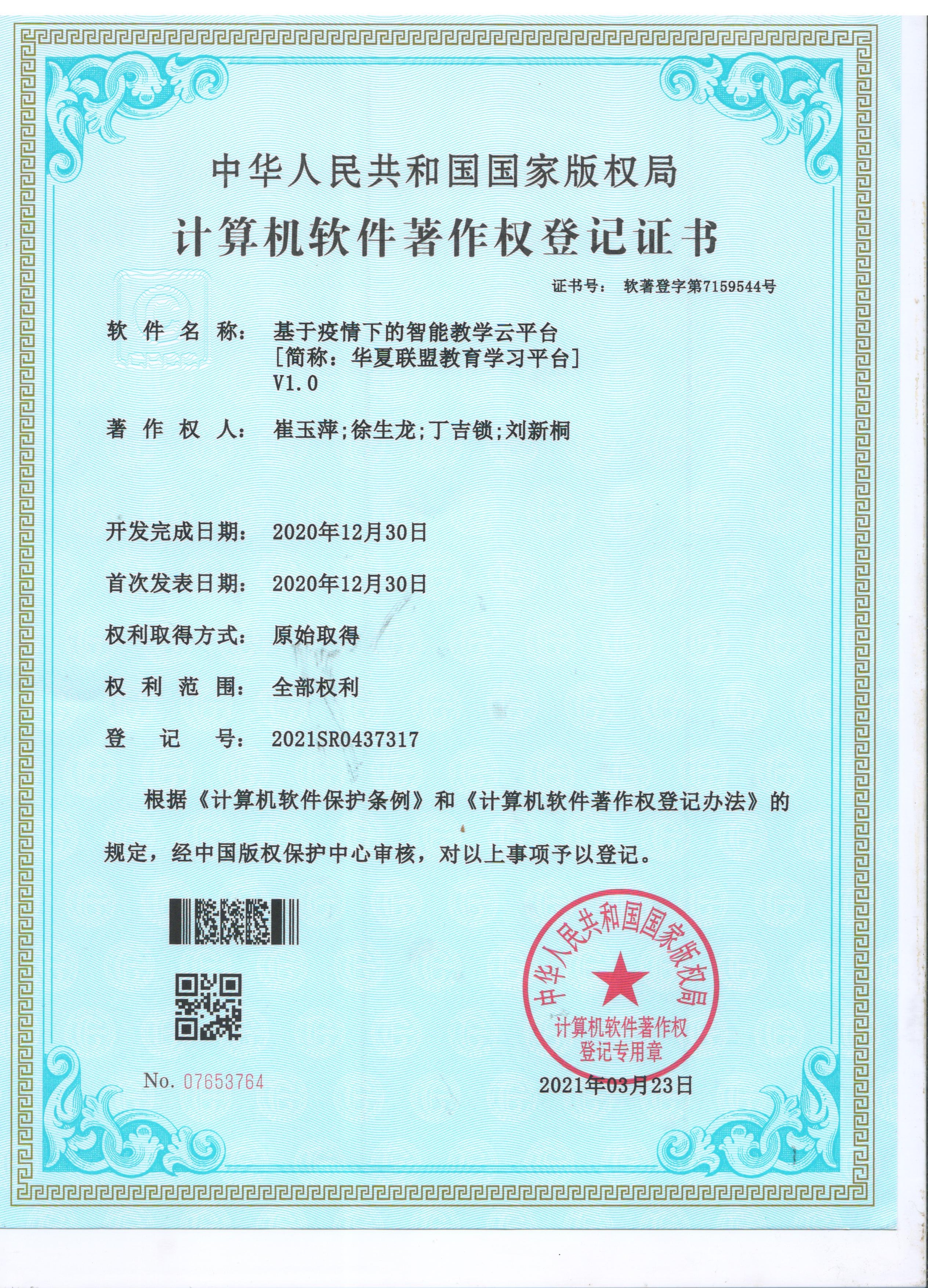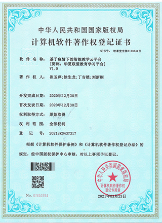 2020年12月項(xiàng)目組成員崔玉萍、徐生龍獲得《基于疫情下的智能教學(xué)云平臺(tái)》軟件著作權(quán)